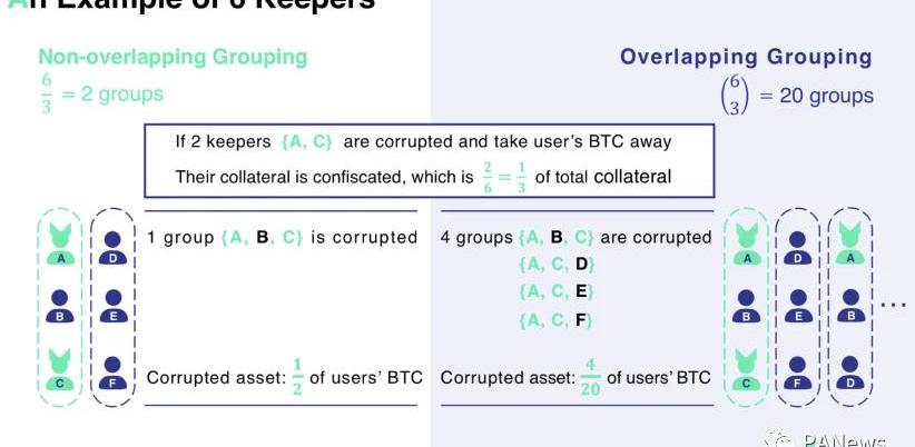 根據DeCus提出的重疊分組,在同等條件下,網絡的安全性優于非重疊分組。舉一個例子,當網絡中6個Keeper時,假設A和C兩個Keeper作惡。若按照傳統的非重疊分組,分為ABC、DEF兩組,其中一組的大多數Keeper作惡,則該組的BTC可以被取走,損失總BTC的一半;倘若按照新型的重疊分組方案,則一共有20種分組,其中BTC受惡意Keeper控制的分組包括ABC、ACD、ACE、ACF四組,受影響的BTC只占總BTC的五分之一。三分之一的節點作惡卻只能影響五分之一的質押品,Keeper作惡成本將大于作惡收益,因此是安全的。