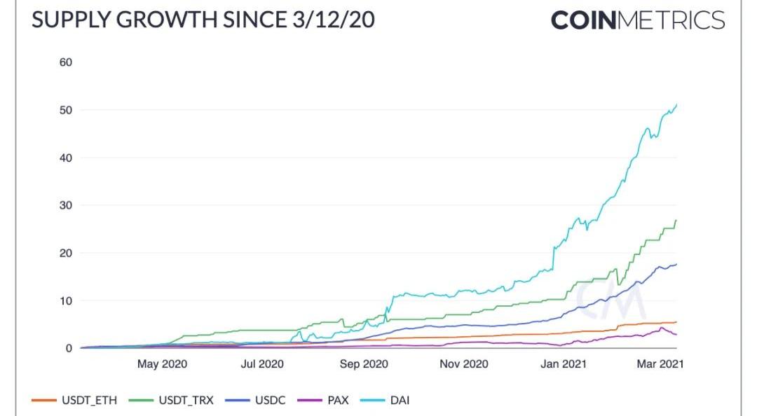來源:CoinMetricsNetworkDataCharts自股災以來,穩定幣也有巨大的增長。最初,穩定幣很可能是在市場波動中用來持幣觀望的。在BTC下跌后,許多人沖進了穩定幣提供的相對安全。但從那時起,穩定幣的使用案例就蓬勃發展起來了。穩定幣現在被廣泛用于去中心化金融(DeFi),并越來越多地用于在世界各地轉移資金。穩定幣也被用于交易,它們被用來進出其他加密資產。自2020年3月12日以來,DAI、USDC和Tron發行的Tether(USDT_TRX)供應量都至少增長了17倍。總體而言,穩定幣總供應量在這一年中從約64億美金增長到超過550億美金。
