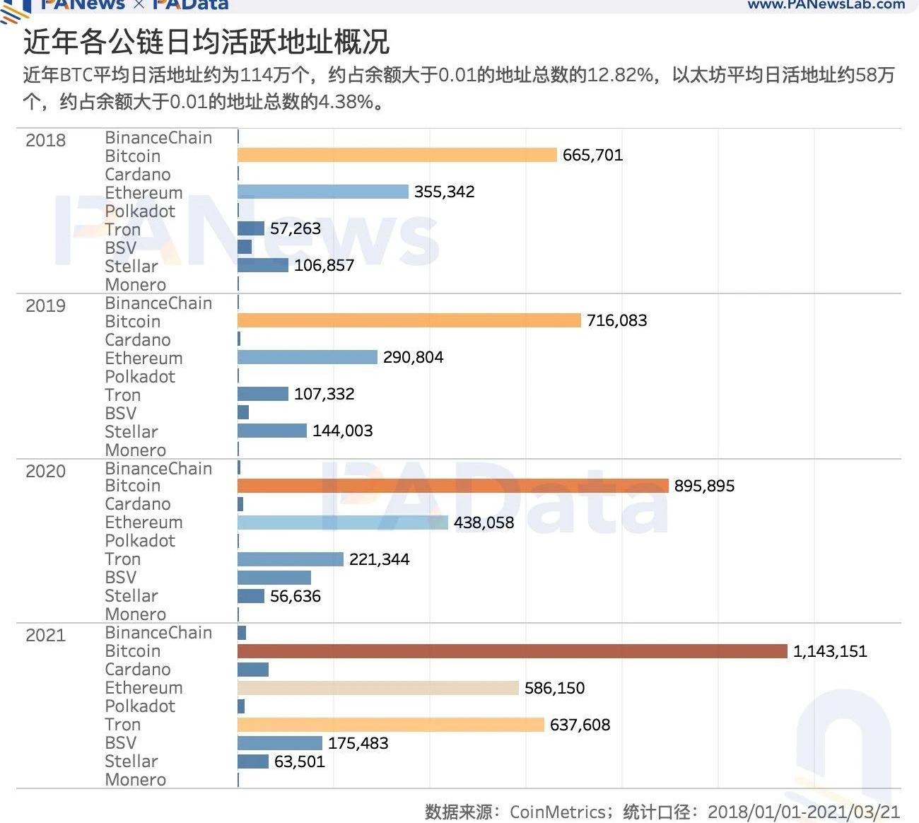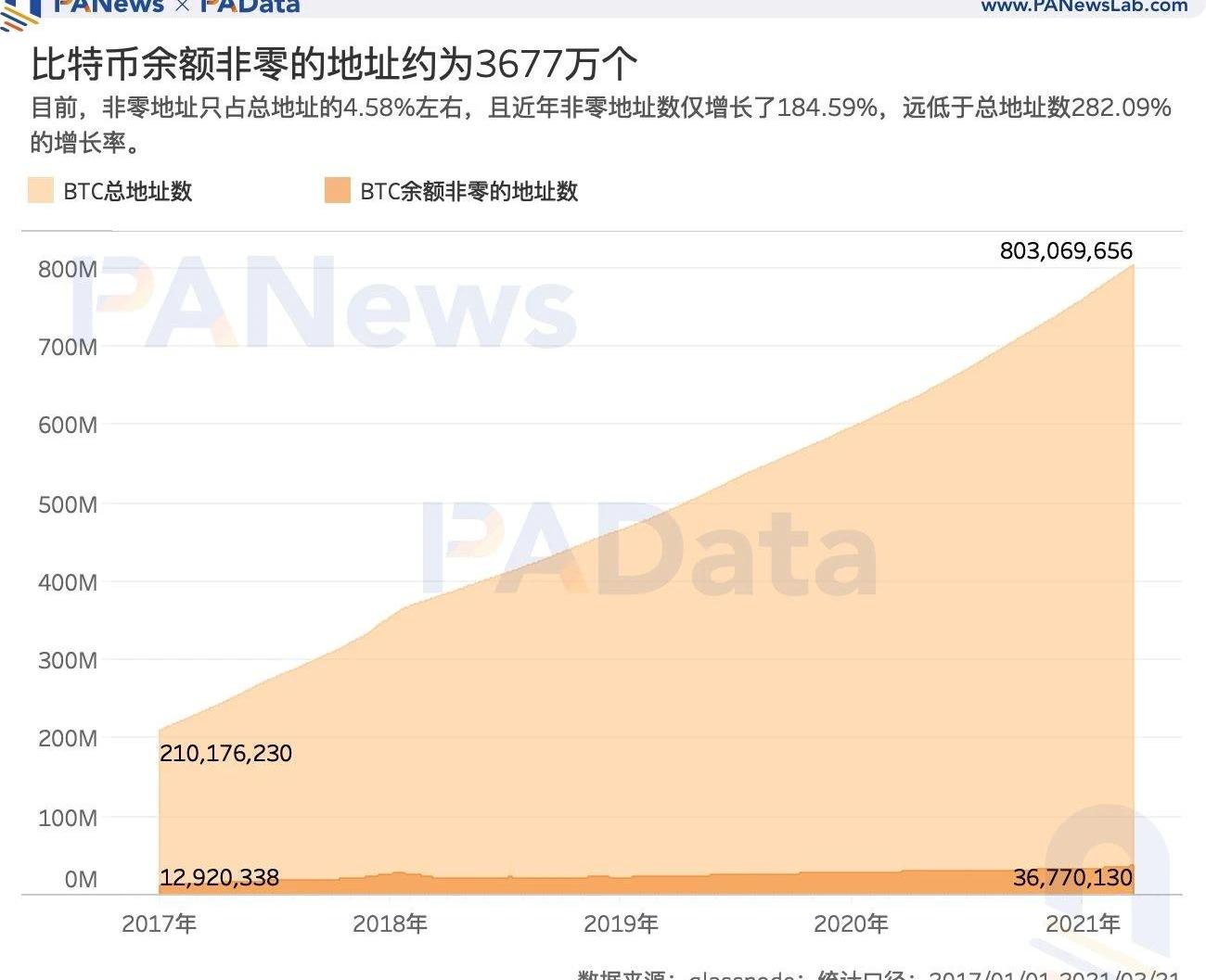 比特幣和以太坊是區塊鏈中最具代表性的兩條公鏈,了解這兩條公鏈的有效地址數是預測區塊鏈用戶規模的基礎。根據glassnode的統計,截至3月21日,比特幣共有8.03億個地址,較2017年初增長了282.09%。但并不是所有地址都是有效地址,其中不少地址的余額已經為0,這部分地址或因注冊后從未使用,或因無法支付手續費等原因基本不可能再與比特幣發生交互,是“沉默”地址。