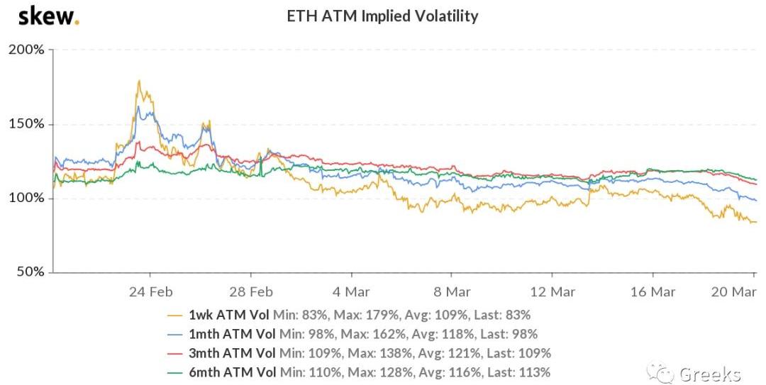ETH歷史波動率10d71%30d97%90d121%1Y92%以太坊今日期權成交量1.24億美元,持倉量26億美元。各標準化期限IV:今日:1m98%,3m109%,6m113%3/19:1m105%,3m115%,6m117%以太坊跟距離前高已經有一個月了,今天的各期限IV也同樣面臨著崩盤式下降。以太坊的短期看跌甚至越來越貴了,1月期Skew也偏向正值。