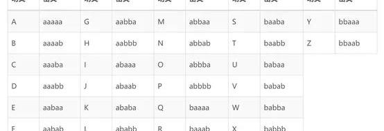 按照上表,明文hello的密文為AABBBAABAAABABBABABBABBBA,顯然,密文的長度是明文長度的5倍。除了上表用來加密小寫明文外,還有一張用來加密大寫明文的表。