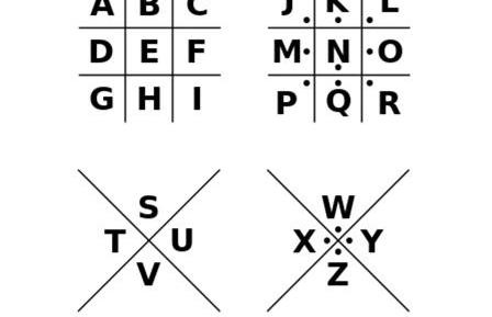 豬圈密碼(Pigpencipher),又稱共濟會密碼(Masoniccipher),是一種以格子為基礎的簡單代換式密碼。下圖為豬圈密碼中所用符號與26個英語字母之間的對應關系: