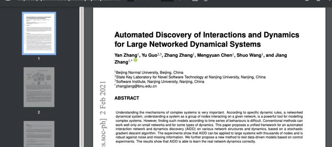集智俱樂部聯合X-Order,嘗試做一次開源科學實踐,把一篇新論文鑄成NFT。集智俱樂部成立于2003年,是一個從事學術研究、享受科學樂趣的探索者的團體,也是國內最早的研究復雜系統和人工智能的科學社區。X-Order是一家專注于數字貨幣和傳統金融領域的投資研究機構,由知名區塊鏈投資機構NGCVentures創始合伙人陶榮祺于2018年初創立,總部設在上海。關于NFT:NFT的關鍵創新之處在于提供了一種標記原生數字資產所有權的方法,且該所有權可以存在于中心化服務或中心化庫之外。NFT的所有權并不阻止其他人視察它或閱讀它,NFT并不是捕獲信息然后把它藏起來,只是捕捉信息然后發現該信息與鏈上所有其它信息的關系和價值。換言之,其實就是發行在區塊鏈上的數字資產,這個資產可以是游戲道具、數字藝術品、門票等,并且具有唯一性和不可復制性。由于NFT具備天然的收藏屬性和便于交易,加密藝術家們可以利用NFT創造出獨一無二的數字藝術品。我們設想,學術論文也可以像藝術作品一樣嘗試鑄成NFT。經過論文作者授權,我們拿出張江課題組2021年新上線預印本網站arXiv的一篇論文,來做這次先鋒實驗:AutomatedDiscoveryofInteractionsandDynamicsforLargeNetworkedDynamicalSystems大型網絡動力系統的相互作用和動力學的自動發現摘要:理解復雜系統的機制非常重要。網絡化動力系統,即把一個系統理解為一組節點按照一定的動態規則在給定的網絡上相互作用,是建立復雜系統模型的一個強有力的工具。然而,根據行為的時間序列尋找這樣的模型是困難的。傳統的方法只適用于小型網絡和某些類型的動態。基于貝努利網絡生成器和馬爾可夫動態學習器,提出了一個基于不同網絡結構和不同動態類型的自動交互網絡和動態發現的統一框架。實驗結果表明,該方法可以應用于具有數千個節點的大型系統,正確地學習了真實的網絡動力學。論文PDF版已在arXiv上線:https://arxiv.org/abs/2101.00179