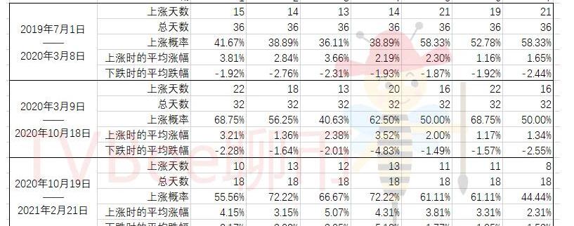 統計結果顯示在第一區間,也就是BTC與美股不相關的區間,2020年3月8日以前,周一到周日并沒有比較明顯的上漲日。在第二區間,2020年3月9月到10月18日,這一階段的BTC與美股具有一定的關聯性。所以,美股開盤收盤對BTC有一定的影響。所以比較明顯,周一上漲的概率最高,周五下跌的概率最高。此外,在這一區間內:周一上漲的概率最大,且上漲的平均幅度比較大,下跌的平均幅度又不太大;周二的上漲概率不明顯,上漲和下跌的波動幅度都比較小;周三的下跌概率比較大,上漲和下跌的波動幅度略大;周四上漲的概率和上漲的幅度都比較大,但一旦下跌、下跌的幅度更大;周五下跌的概率最大,上漲的幅度較小,下跌的幅度小;周六上漲的概率最大,但上漲和下跌的幅度小;周日上漲下跌的概率一半一半,但上漲的幅度小,下跌的幅度較大。目前,如果BTC再次進入美股關聯區間,上面這些數據或許有一點參考價值。在第三區間,就是BTC與美股幾乎脫錨的區間,周一到周六上漲的概率都不低,其中周二和周四上漲的概率最高。如果以一周為單位,周一作為本周的風向標,觀察周二到周日與周一波動的方向是否一致: