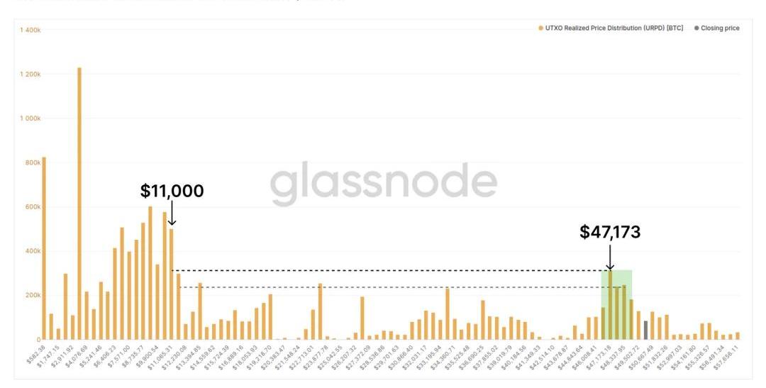 事實上,如果我們看UTXO實現價格分布,47173美元的鏈上支撐位是價格11000美元以來最大的。此外,下圖綠色顯示的鏈上活動塊,不僅僅是一個具體的底價,而是一個大的支撐區。我們可以看到在45.5k美元和48.9k美元之間有持續而顯著的交易量。這個區間現在代表了歷史上最大的鏈上BTC累積水平之一——是上個周期的2萬美元ATH被突破以來最大的。