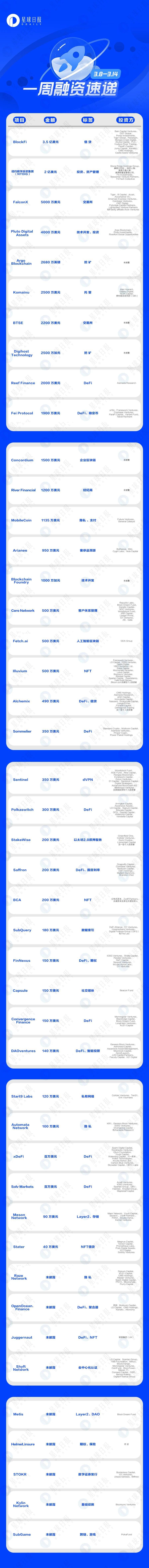 XRP/HKD-4.44%據Odaily星球日報不完全統計,3月8日-3月14日當周公布的海內外區塊鏈融資事件共45起,其中值得關注的包括:BlockFi確認完成3.5億美元D輪融資,估值30億美元;加密貨幣交易初創公司FalconX完成5000萬美元融資,Tiger、BCapital領投;穩定幣協議FeiProtocol完成1900萬美元融資,a16z、CoinbaseVentures、Framework等參投。