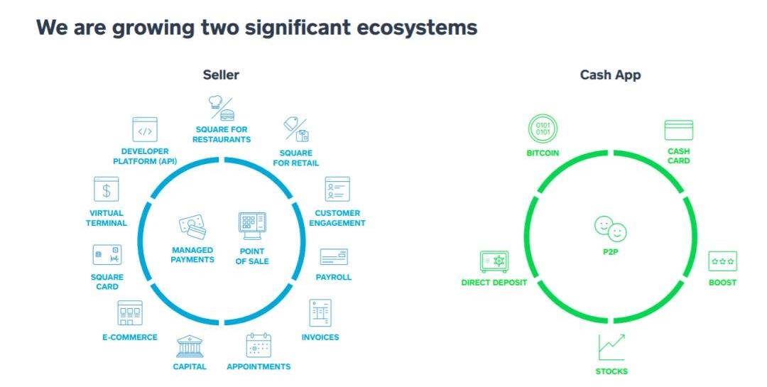 Square提供了兩套完整的產品生態,一套是他們的SellerEcosysterm,面向中小零售商提供支付服務,一套是CashApp生態,以P2P支付為核心,提供了包括比特幣在內的多種服務。
