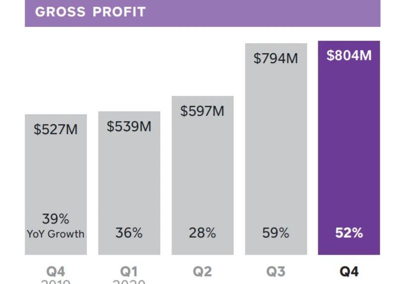 (數據來源:Square2020年4季度投資者報告)根據20年第四季度財報,Square在第四季度毛利潤達到了8.04億美金,同比上漲52%。其中,SellerEcosysterm帶來了4.27億美金的毛利潤,同比上漲13%;CashApp毛利潤3.77億美金,同比上漲162%。