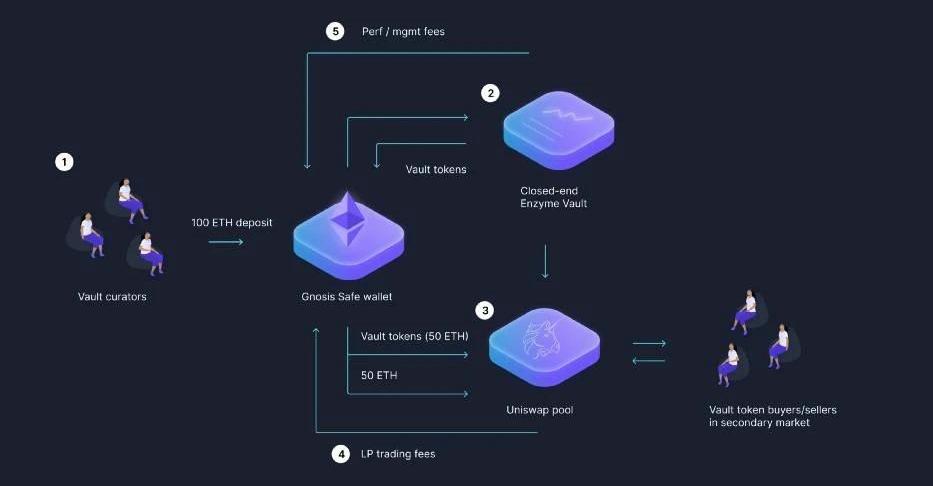 再平衡成本可能會變得相當昂貴!想象一下,如果你從不需要再平衡,或者你只是在一定的時間間隔進行再平衡。其中一個用例是創建讓流動性提供者得到獎勵的封閉式池子。這是怎么實現的?決定一個被動策略;成立一個早期金庫管理人小組,用資金為這個金庫預先播種。一旦達到目標后,就關閉金庫,并禁止任何新的存儲用戶進入;將100ETH存入GnosisSafe錢包;使用Gnosis-Safe在Enzyme上創建一個金庫,并選擇一個你想要嵌入的費用選擇;當用戶將50ETH存入這個金庫后,他就會獲得金庫代幣;將50ETH和50金庫代幣存入Uniswap資產池;GnosisSafe將從這個金庫以及Uniswap資產池賺取到費用;在GnosisSafe種子存款人之間適當分配費用;根據需要定期重開設金庫,以進行其他播種階段;好處:兩種費用收益來源;節省gas:由于二級市場的原因,無需定期再平衡;用戶可以在Uniswap上購買代幣,因此可支付更少的gas費用;用例二:代幣化費用以激勵早期存儲用戶