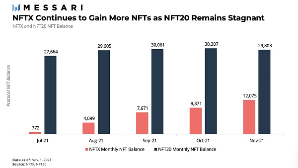 上圖:自今年7月以來,NFTX 繼續獲取更多的 NFTs,而 NFT20 的增長相對停滯。