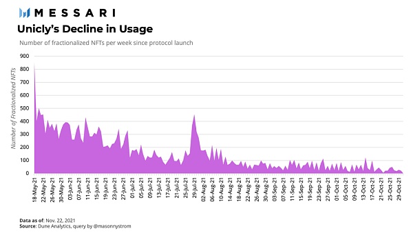 被碎片化的 NFTs 的數量峰值與今年 NFT 市場周期的峰值大致一致。當前 ,Unicly 協議的使用量略有下降,部分原因是由于其競爭對手 Fractional 的推出和流行。