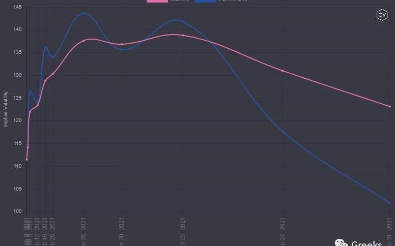 BTC歷史波動率10d74%30d101%90d78%1Y84%期權成交量4.2億美元,目前持倉量為53億美元。各標準化期限隱含波動率:今日:1m101%,3m104%,6m103%2/1:1m109%,3m108%,6m106%比特幣今天波動不大期限結構已經恢復成常規形態,市場盤整很久了,IV略有下降。