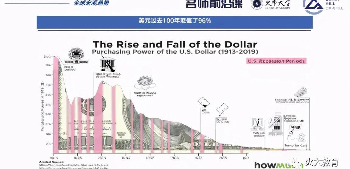 2.全球宏觀趨勢越來越多的投資機構,把黃金的風險敞口逐漸地分配給比特幣,這在美國的相關基金中越來越多。接下來,我們一起聊聊全球的宏觀趨勢。在信用貨幣時代,大家都了解貨幣是會貶值的。但貨幣貶值的屬性究竟有多恐怖,其實很多人并沒有一個直觀的概念。我們可以看一下這張圖,從美聯儲誕生的1913年起至今,在這一百多年間,100美元面值的美元到現在貶值成3塊8毛。