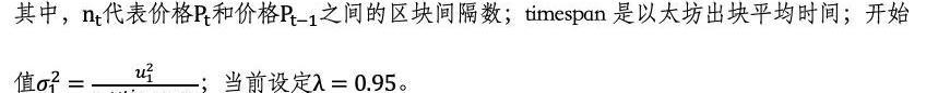 2.1波動率的計算與衡量由于價格是一個隨機過程,實際的波動率永遠是一個未知數,或者說,實際波動率是無法事先精確計算的,人們只能通過各種方法得到它的估計值,這類似于統計學中總體參數的概念,總體參數一般是未知的,需要通過樣本統計量去估計,價格的標準差就是最簡單最常見的波動率統計量,同時樣本和時間周期的選擇都對波動率有較大的影響。考慮到鏈上的計算費用,我們采用指數平滑移動平均模型來計算NEST有效報價的波動率。時間比較久遠的變量值的影響力相對較低,時間比較近的變量值的影響力相對較高。指數平滑法對波動率的計算需要保留上一個的波動率值和最近連續兩個價格數據即可,運行也相對簡單很多,這是一個很好的減少內存空間和gas費消耗的做法。NESTv3.5提供的波動率指標具體計算方法如下。假設NEST預言機區塊價格服從幾何布朗運動模型或資產價格的對數收益服從幾何布朗運動模型。設: