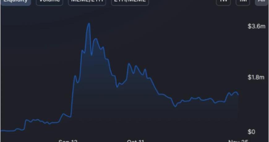 來源:DappRadar日活躍錢包數在10月達到峰值,為1449個,11月降至774個,而RARI代幣價格降至2.34美元,與歷史最高價9.75美元相比,下降了76%。另一個名為Meme.ltd的項目允許用戶押注持有的MEME代幣,每個錢包最多押注5個,用以挖掘限量版的NFT。如下圖所示,Meme.ltd的日活躍錢包數在9月經歷了最高峰,達818個,11月降至56個,而MEME代幣價格下降到222美元,與歷史最高價1414美元相比,下降了84%。
