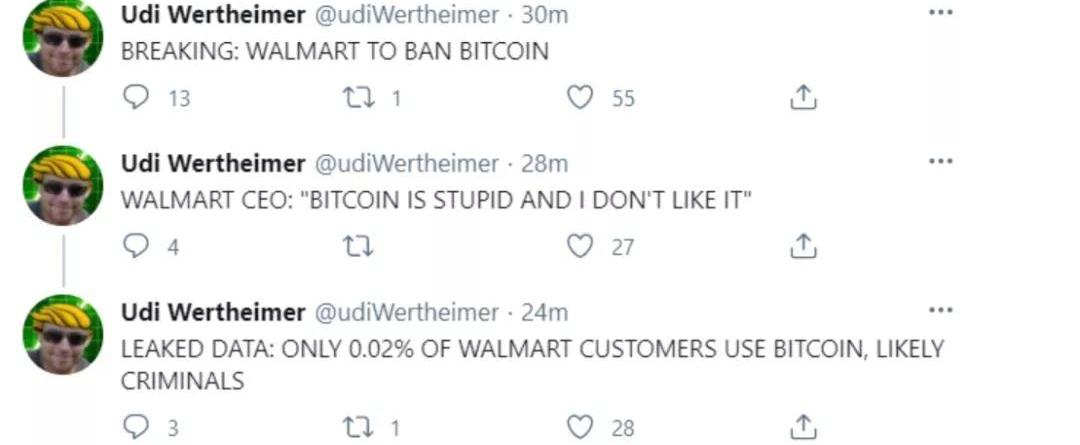 XRP/HKD-1.22%當前比特幣盤面顯得不冷不熱,包括市場情緒也是如此,但可以確定的是,短時間內市場無意營造進一步下行的氛圍,每當一個空頭消息出來的時候,總能看到更積極的多頭消息進行反擊。這邊,沃爾瑪方面剛傳出禁止使用比特幣,比特幣開發者UdiWertheimer發推文稱:“突發新聞:沃爾瑪將禁止比特幣。沃爾瑪首席執行官稱‘比特幣很愚蠢,我不喜歡它’