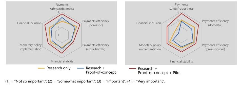 1.中央銀行對CBDC的興趣進一步增加在過去的四年中,積極從事CBDC研究工作的中央銀行的比例增加了大約三分之一,現在達到86%。調查數據顯示,與零售CBDC相關的工作越來越受歡迎,越來越多的中央銀行要么同時關注批發和零售業務,要么將工作范圍縮小到僅零售業務。目前仍未參與任何CBDC工作的中央銀行均位于較小的轄區。研究還表明,在手機使用率高、創新能力強的國家中,CBDC研究的熱情更高。目前,大約60%的中央銀行正在進行實驗或概念驗證,而14%的中央銀行正在進行試點安排。需要注意的是,加強CBDC研究工作并不代表實際啟動CBDC發行的決定。