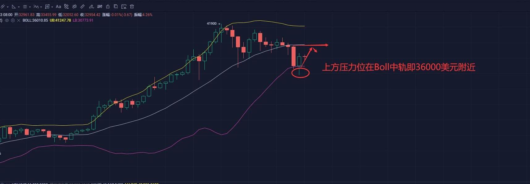 根據日線走勢看,今天還有機會反彈一下,若是下影線能更長一點,下周的走勢就會更穩妥一點,現在如果一周前幾天沒有探底就直愣愣的網上沖的話,那本周后幾天沖高回落的概率很大,因為當前的行情并不具備直接強勢拉漲的基礎。若是前幾天先下跌,反而可以對后面幾天的行情有所期待,先探底總比先上漲了再回落探底要好。日線方面,昨天探底一度跌到了BoLL下軌之外,形成了超賣信號,而昨天順勢反彈剛好回到BOll軌道內,當前來看上方的壓力位在36000美元,剛好在Boll中軌處,但當下最直接的壓力位是33000美元,能站上33000美元下一步就是展望36000美元。
