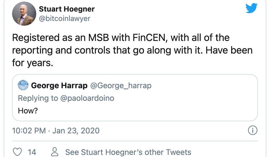 Tether的總顧問StuartHoegner也提出了同樣的建議。在回答Twitter上關于Tether如何被監管的問題時,Hoegner暗示,正是Tether在FinCEN的注冊才使得Tether有資格成為受監管的金融機構。