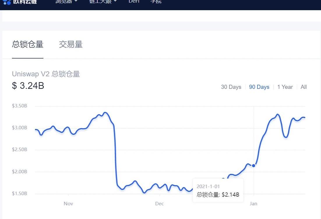以頭部項目Uniswap為例,在結束流動性挖礦后,Uniswap鎖倉量一度下降至16億美元的90日低位,其代幣Uni價格也跌至2美元以下。而自12月中旬開始,Uniswap的鎖倉量開始回升,并在近期重回30億美元的關口;代幣Uni的價格同樣自低位持續上漲,漲幅和走勢與Uniswap的鎖倉量呈現出較為明顯的關聯。