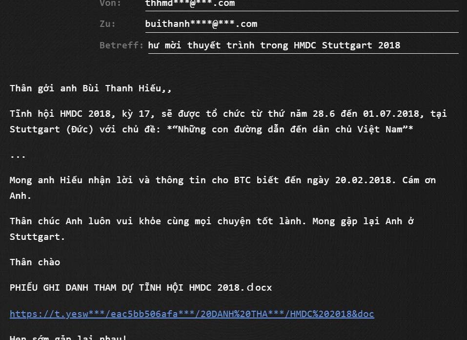 Bui一收到警告便取消了行程。他擔心自己可能被人監視了,越南政府可能將他們的觸角伸到了德國。然而他不知道,黑客的觸手已經伸向了他的郵箱。Bui很謹慎,他料到黑客盯上他已經有一段時間了,但這一次,他們是有備而來的。這些黑客顯然知道他要去參加斯圖加特的會議,而且利用這一點來引他上鉤。會議前六周,他收到了一份邀請函。這是黑客發來的一封電子郵件,里面附有惡意軟件。他點了進去。