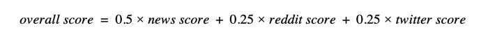 現在,每篇文章都有一個相關的來源,一個風險概率和一個計數,指的是文章被轉發、分享或轉發的次數。為了將這些風險概率轉換為加密貨幣實體的單一風險得分,我們首先將文章的概率值縮放到0到100的范圍內,并獲得每個來源的加權平均值,結合文章的風險得分和計數。加權平均數用于對計數較高的文章給予更大的重視,因為份額數量很可能表明文章的相關性或重要性。
