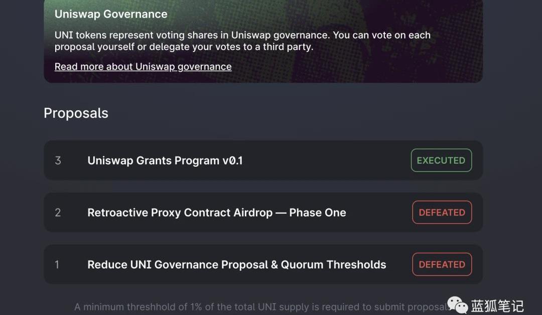 藍狐筆記估計,未來Uniswap會迭代其Layer2解決方案,當時機成熟時,采用ZK-rollup的可擴展方案也是有可能的。*治理的突破Uniswap的治理是Uniswap持續發展的關鍵。