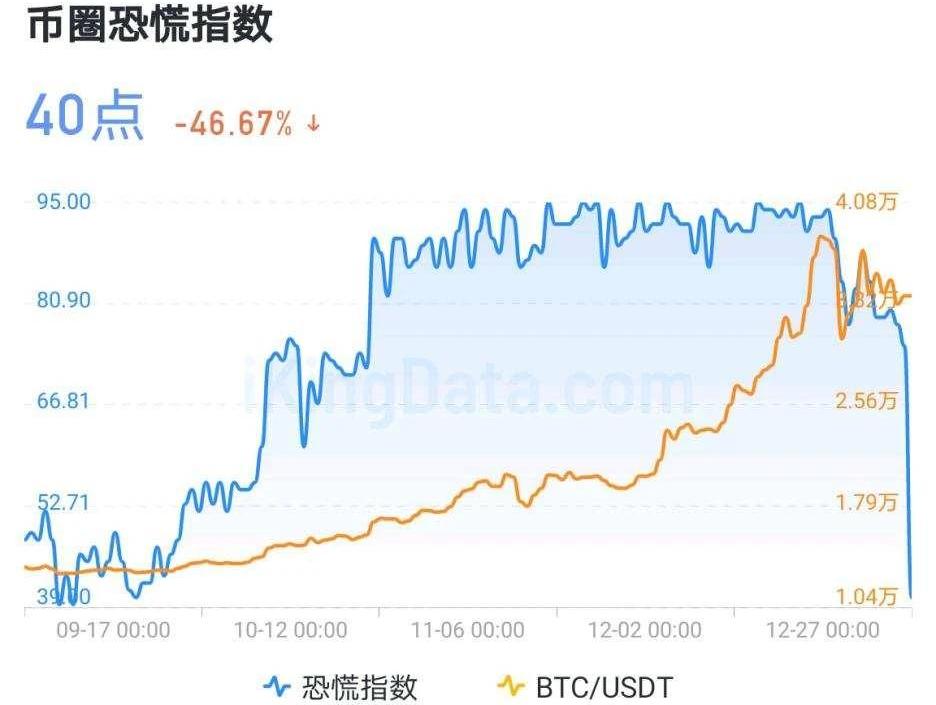 XRP/HKD-4.23%以下內容數據來自KingData,轉發、引用請注明數據源為KingData。KingData用數據賦能交易,快人一步遇見財富。2021年1月8日,BTC價格突破4萬美金,再創歷史價格新高41969美元/枚,整個加密幣行業興奮了,甚至延申到了整個金融圈。“幸福來的太快就像龍卷風,吹完它就走!”時隔不足半月,BTC價格現已回到3萬美金附近,單價下跌超1萬美元,跌幅超23.83%。市場中的投資者逐漸暴露出恐慌、懷疑,“比特幣的牛市結束了嗎?”幣圈恐慌指數從自95附近跌至40,僅1天時間就從75跌至40。