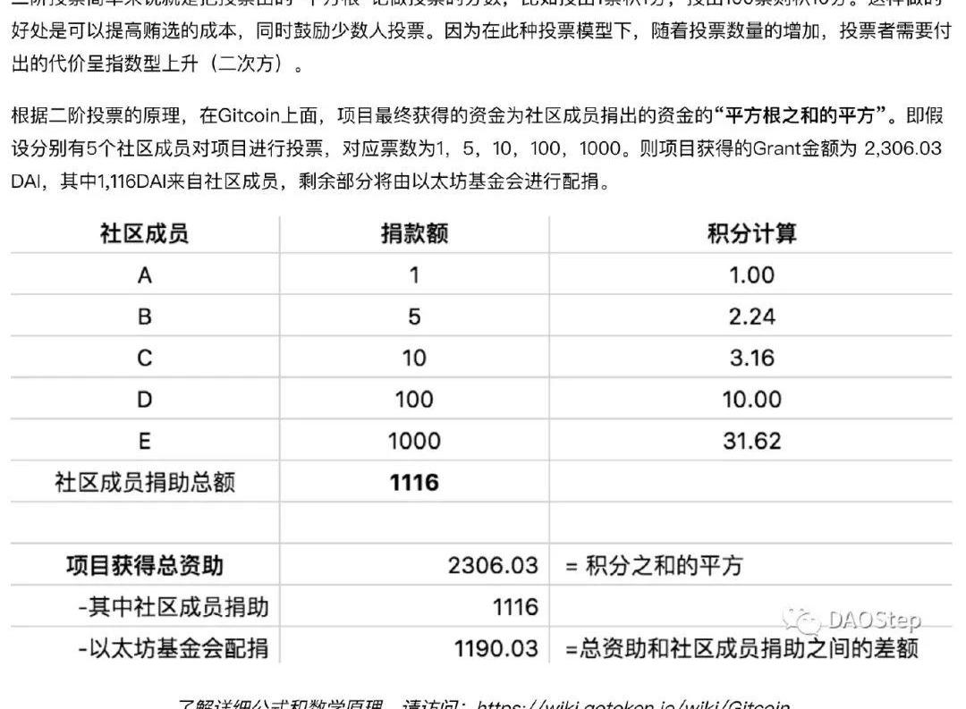 XRP/HKD-1.7%編者按:本文來自去中心化金融社區,Odaily星球日報經授權轉載。Gitcoin是什么?它是Vitalik為了解決以太坊生態項目融資效率低的問題而提出來的算法構想的社區產品,Vitalik另一個更有名的被社區實現的算法構想是Uniswap。如果說Uniswap在ETH1.0上通過AMM算法重構了二級市場的交易體驗,那Gitcoin則通過“二階投票”的算法重構了對早期社區項目的種子投資方式。通過Gitcoin獲得資金的知名項目包括:Tornado.cash、Uniswap、1inch.exchange、DuneAnalytics、MolochDAOGitcoin這一關鍵字下對投資者有價值的信息源包括:每一期的GitcoinGrand列表都是真金白銀投出來的,可以在項目并不是最熱的時候發現它們,如果回頭去翻第1到8期列表,會發現被大家熟知的DeFi項目都曾經在這里出現過。Vitalik對每一期gitcoingrand的總結是非常不錯的方向性資料,能夠獲得框架性、實時性的行業分析,是可以作為季度報告看的。如果還希望看到更早期的項目,可以關注gitconkernel,可以理解成這是互聯網投資領域常見的孵化器。我本身也是Gitcoinkernel的第一期成員,直觀感受是該信息源下的信息密度相比前兩個較低,開發者質量參差不齊。當然Gitcoin的也不是萬能的。YFI的創始人安德烈為了獲得代碼審計的支持報名過某一期GitcoinGrand,但是被其他項目淹沒了。如果放在VC的邏輯里看,應該算是巨大的方向性踏空。有人形容Gitcoin是以太坊的“軍火庫”,每一條公鏈都希望有一個Gitcoin,但是只有ETH具備激活這一產品的社區活力。這份活力中的要素包括:1.有錢有意愿的基金會2.積極的開發者3.熱情且略帶理想主義的社區用戶4.項目商業化所需的市場5.成熟的開發體驗本文作者DaniloLessaBernardineli,MichaelZargham和JeffEmmett,通過cadcad這一工具分析了Gitcoin配資算法在實際運行中是否有效,有關cadcad的價值未來找機會再說。要看懂該分析文章,是需要對Gitcoin的“二階投票”算法有所了解的,可以看下面表格的解釋: