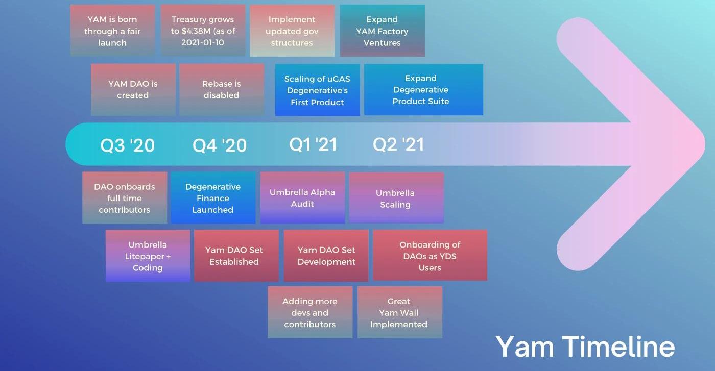 YamDAOSet——投資產品狀態:開發中-計劃于2021年1月啟動優先級:中等簡介:YDS將具有內置功能,可為“受管理的資產”收取管理費。YDS將是一種市場化的產品,我們可以吸引其他具有Treasury和零售用戶的DAO,從而為Yam生態系統帶來額外的收入。下一步:使用Treasury資金運營YDS以證明其功能性帶有Treasury的其他DAO吸引零售用戶Umbrella狀態:已啟動Alpha版本優先級:高級簡介:Umbrella是一種DeFi保護協議,允許用戶獲得提供保護的回報或獲得保護以換取保險費。它具有對任何DeFi協議的無許可的metapool創建和保護的功能。下一步:安排Peckshield進行安全審核繼續進行內部上限存款測試審核后發布Beta測試版DegenerativeFinance狀態:已啟動優先級:高級簡介:Yam將利用UMA的金融合約和DVM,創建一個從uGas期貨開始的鏈上指標衍生產品套件。現在可以在Degenerative.Finance上使用uGas期貨。這是一個令人興奮的產品類別,具有投機和對沖用例,目前任何現有的DeFi平臺均未提供。此外,UMA還為在其基礎架構上進行開發的人員提供開發人員挖礦獎勵,從而使Yam可以立即開始通過該產品線獲利。這是與UMA團隊的直接合作,我們將接管最初開發的gas期貨合約。下一步:改善uGas的UI開始構思和制定其他合約建立更廣泛的產品線YamFactory現狀:概念構思階段優先級:低簡介:YamFactory是協議工作室或孵化器。想要生產產品的團隊可以申請從Yam生態系統獲得資金和技術/營銷/設計支持。這種伙伴關系旨在為所有相關方創造價值。下一步:創建Factory運作方式的框架作為VC替代品開始向DeFi生態系統推廣協議:
