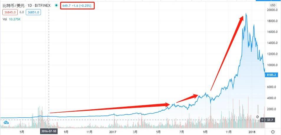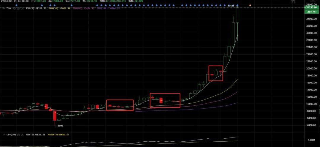 從3800到38000,中間差了一個0,也就是十倍。比特幣用不到一年的時間從最低點上漲到十倍。我知道沒有多少人能把握住這個十倍,即使是在3月12日之后拿到5000美金的比特幣,到現在也有7倍收益。我們看看中間都有什么樣的形態。