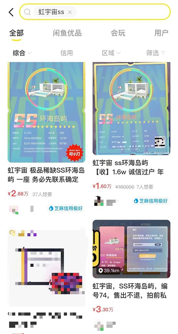 這些限量發行的房型在閑魚上一時形成了“炒房熱”。此前,最夸張的一套虹宇宙虛擬房產“SS環海島嶼”甚至炒到了99.99萬元。截至目前,咸魚上仍有多套虛擬房產價格破萬。