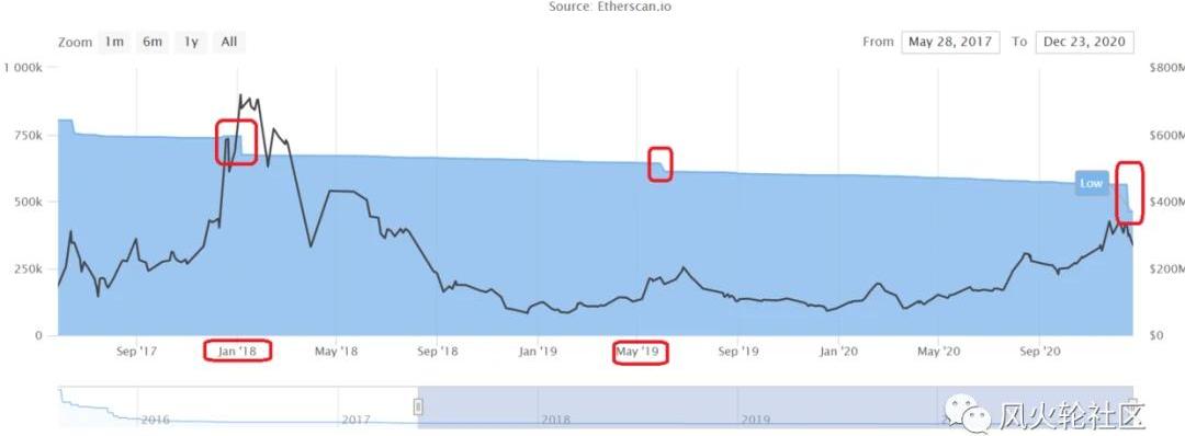這個地址最早有1190萬枚eth,隨著早期投資人、聯合創始人的利益分配,加上早期運營經費等,在17年初持倉就下降到了100萬枚eth以下。目前該地址有45.9萬枚eth,占到總流通的0.4%,也算是真正意義上的去中心化了。我們再把持倉變化放大來看: