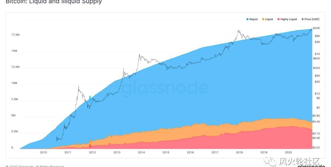 之前我們有說過現在比特幣處于一種流動性缺乏的狀態,需求多于供給造成了價格的直線上升,最近glassnode也專門做了一份數據,可以看看這篇內容:https://insights.glassnode.com/bitcoin-liquid-supply/這里我簡單說下。按幣的流動頻率分為三種:Illiquid是常年不動的籌碼,liquid是差不多一年內有移動過的籌碼,Highlyliquid是活動頻繁的籌碼部分,他們的分布如下圖: