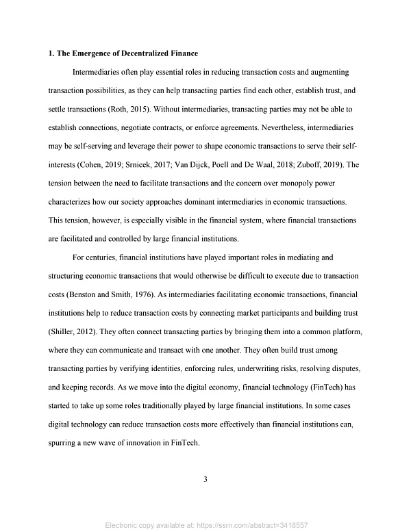 在去中心化的金融體系中,金融交易不是由集中的機構促進的,而是由去中心化的點對點網絡促進的。通過減少集中式機構的參與,去中心化平臺可以降低交易成本,同時創造網絡效應,使所有參與者受益而不會產生壟斷成本(Catalini和Gans,2019),因為沒有一個實體可以積累足夠的壟斷力量來不利于其他人(Huberman,Leshno和Moallemi,2019)。
