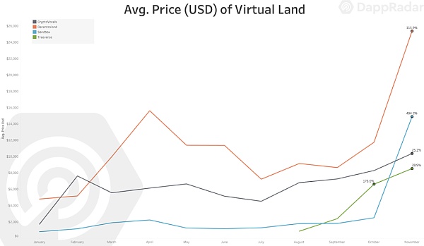 此外,值得注意的是,對虛擬土地的需求有所增加。需求的增加通常會轉化為價格的變化,從而支持最近對虛擬房地產的估價。影響最為顯著的是 The Sandbox,從 10 月到 11 月,涉及虛擬土地的交易數量增加了 421%。同樣,受到其他 BVW 的支持,他們對各自虛擬土地的需求至少翻了一番。