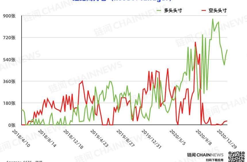 分項數據上來看,規模較大的經紀商持倉多頭頭寸自573張進一步上漲至620張,創近四周新高,空頭頭寸自30張微漲至32張,大型機構在最新統計周期內仍然進行了相當明確的多單增持,相比于大幅下降的總體持倉表現,經紀商賬戶在這個行情持續快速上漲的背景下仍然表現出了相當強的追漲信心,而從結果上來看BTC也確實在新年伊始就完成了對于30000美元整數大關的強勢突破,大型機構在2020年收官的一期周報中再度表現出了精準的判斷能力,在市場的減倉潮中「力排眾議」繼續追多的一手操作相當精彩。