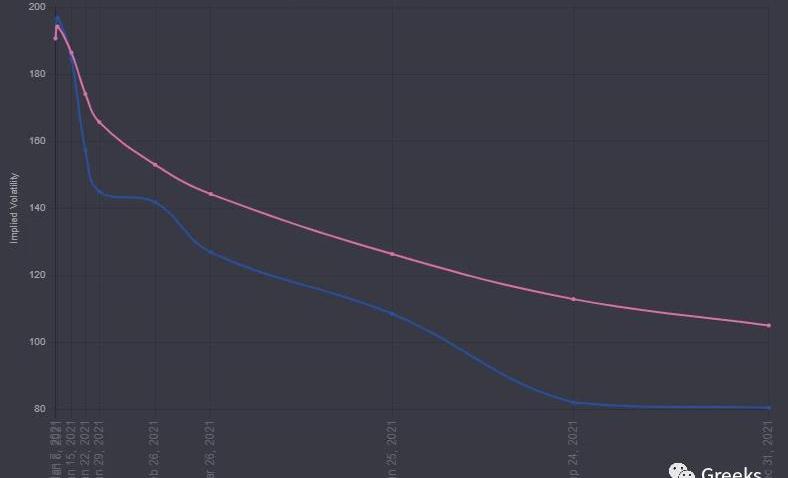ETH歷史波動率10d129%30d107%90d87%1Y107%以太坊今日期權成交量1.96億美元,持倉量13億美元,短期的暴力波動暫時告一段落。各標準化期限IV:今日:1m165%,3m144%,6m126%1/5:1m144%,3m129%,6m105%以太坊波動繼續暴漲,但是各項指標出現明顯回落,這也是背離的一種形式,謹慎看好短期后市,期權流動性有所改善。
