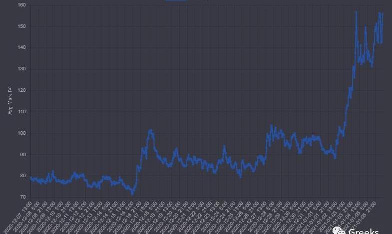 BTC歷史波動率10d63%30d67%90d62%1Y81%期權成交量13億美元,目前持倉量為72億美元,持倉量70多億讓人感到有些夢幻。各標準化期限隱含波動率:今日:1m122.4%,3m112.5%,6m104.4%1/5:1m99.8%,3m101.5%,6m94.1%比特幣今天再創新高,各種市場情緒達到了全面狂歡,當月期的IV都有120%以上,這種市場對于看漲期權的賣方有些難受,對于期貨做空的就是血虧了。