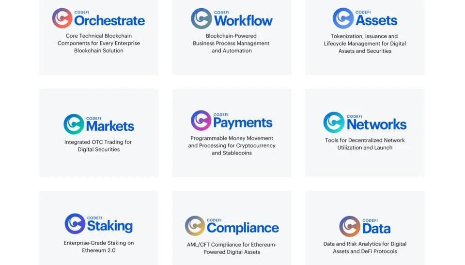 Codefi是為商業和金融提供的區塊鏈應用套件,旗下的應用和工具包括:Orchestrate:企業級解決方案Workflow:區塊鏈驅動的業務流程管理和自動化Assets:資產或證券代幣化與發行Markets:為數字證券提供場外交易Payments:加密貨幣與穩定幣的資金轉移處理Networks:啟動去中心化網絡的工具Staking:企業級以太坊2.0質押工具Compliance:為以太坊網絡的數字資產提供反洗錢等合規解決方案Data:為數字資產和DeFi協議提供數據和風險分析年度數據:在CodefiActivate中質押的Skale項目代幣SKL超過1.67億個;在Codefi上代幣化的房地產基金為3.5億美元。