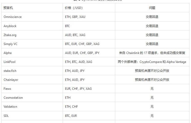 AmpleForth:接下來,我們調研所有由AmpleForth的預言機發起的交易。我們的發現如表4所示,截至2020年4月,AmpleForth的兩個市場預言機中分別發生了30和34次被回退的交易。Synthetix:Synthetix完全集成了Chainlink的服務用于報價。Synthetix支持的每種資產類型都有相應的一組Chainlink節點,以完成類似于預言機的任務。我們進一步調研所有交易對的節點-ETH/USD,BTC/USD,AUD/USD,EUR/USD,CHF/USD,GBP/USD,JPY/USD,XAG/USD和XUG/USD,以找出潛在的故障。在表5中,我們提供了有關預言機的詳細信息,其相應數據源以及遇到的問題。我們發現Omniscience,Ztake.org,Anyblock和SimplyVC提交過被以太坊網絡回退的交易。到2020年2月14日,AlphaVantage收到Chainlink的17項請求,但忽略了它們,未成功提交答復。LinkPool使用兩個外部來源獲取ETH,BTC,AUD和XAG匯率。但是,AlphaVantage不可靠也使LinkPool也變得不可靠。Fiews,Cosmostation,Validation等是穩定的節點,沒有發現異常,而stake.fish和Chainlayer的來源尚不對公眾開放,因此無法進行審核。