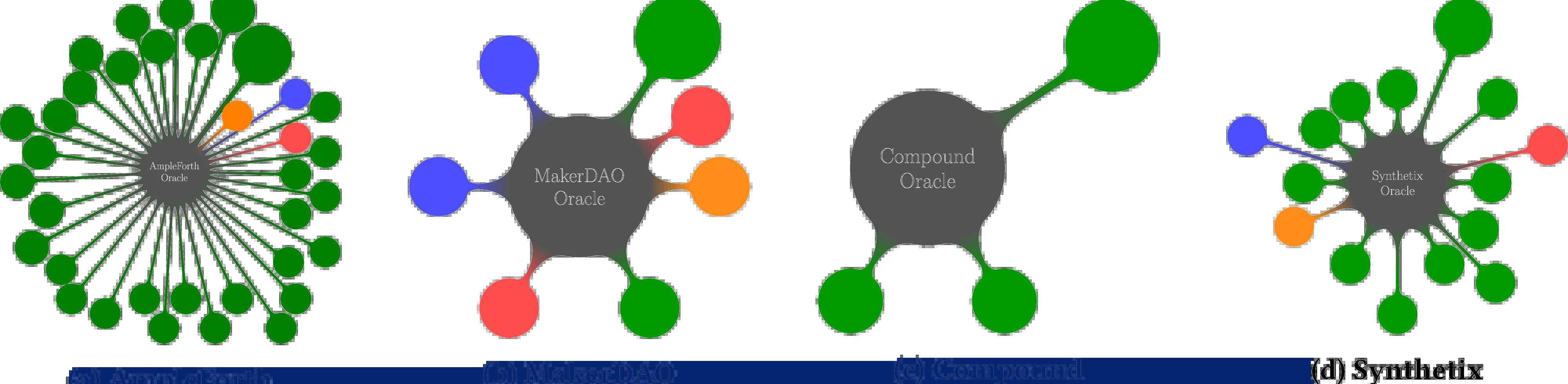 AmpleForth:我們從AmpleForth的市場Oracle收集了132,119筆交易,發現與預言機交互的地址有47個。如圖12a所示,整個交易的很大一部分是與Chainlink聚合器的交互,顏色為綠色。紅色節點表示市場預言機有161筆交易使用AmpleForth的UpgradeProxy合約來設置或更新某些參數。藍色和橙色是外部賬戶地址,分別涉及48和1筆交易。預言機于2020年3月13日連續向藍色節點發送了48筆沒有輸入數據的交易。MakerDAO:類似地,我們使用MakerDAO的ETH/USD預言機作為我們的測量對象,提取4,914筆交易,進行分析,結果如圖12b所示。圖中預言機與來自七個不同地址的四種類型的實體進行交互,大多數交易都與價格發布行為有關,但是,由于gas用盡的錯誤,有兩個交易失敗。它進行了四次代理活動,而只有三次代幣轉移成功。此外,當平臺決定進行SAI和DAI轉換時,還有一項遷移活動。Compound:我們在Compound中選擇了一個ETH/USD的預言機,分析其所有11,458筆交易。所有交易均涉及與三個鏈上聚合器交互的報價操作。與其他平臺的預言機不同,交易歷史記錄不包含與其他參與者或服務的交互。Synthetix:圖12d中展示了Synthetix預言機的142,422筆交易組成的圖。與其他平臺類似,該平臺ETH/USD預言機主要與綠色標記的活躍聚合器合約進行交互。聚集器之中的一個禮物是橙色節點,該聚集器在原因不明的情況中自毀了。除此之外,預言機還參與了與Synthetix網絡相關合約的2,056筆交易,大多數是從平臺獲取參數值。一個有趣的活動是總計667筆發送給自身且沒有輸入數據的交易。4.討論