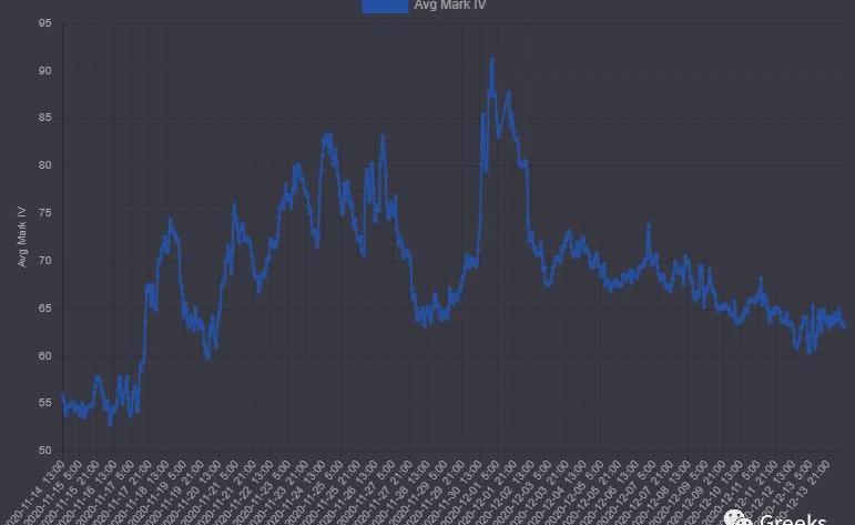 BTC歷史波動率10d49%30d65%90d52%1Y79%期權成交量4.43億美元,持倉量穩定,目前為39億美元,市場相對平靜。各標準化期限隱含波動率:今日:1m62.8%,3m69.5%,6m75.4%12/13:1m59.1%,3m67.2%,6m73.5%各期限的IV因為價格拉升而上漲,目前市場規律比較明顯,IV會在橫盤期間下降,反彈期間企穩,明顯上漲時反彈,略滯后于價格移動。
