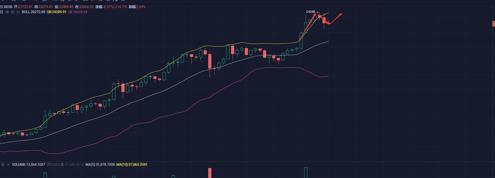 昨晚出手時,剛剛好是回調的最低點附近,這一次出手非常堅決,回調的最低位,直接下手6.5億美金,所以昨晚國內市場就有人調侃,我們這邊因為恐慌都把幣拋掉了,結果人家一個不漏的全都接了回來。回到行情上,當前行情是再次回到了原先的波動區間,即22300-23300美元區間,可以看出來小時線級別有隱隱的震蕩下跌跡象,高點在不斷降低,低點也在不斷降低,這種現象是日內,但也提醒我們當前不應當掉以輕心,還會有探底的可能性。