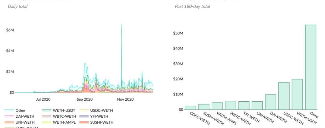 頂尖交易所丨業務總量(GMV)6.收入--用戶為使用一個項目的服務支付了多少錢?計算方式為GMV*收益率。目前,收入指的是項目用戶支付的總費用。如果有的話,我們還包括了協議的用戶和所有者之間的總收入如何分配的數據。