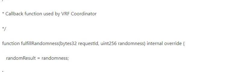 執行時,這個函數將請求發送到給定的VRF協調器合約,然后建立一個最終種子,并將其發送到該VRF協調器的Chainlink預言機。最后的種子是用以下值的哈希值建立起來的。-用戶提供的種子-滿足請求的Chainlink預言機的公鑰哈希值-請求時的用戶nonce-提出請求的合約地址-當前區塊號使用這些額外的值的原因是為了防止合約使用相同的種子不止一次地得到相同的結果。nonce有助于防止合約在同一區塊內做多個請求,所以理論上,合約可以在同一區塊內使用相同的種子為請求多個隨機數,而且他們仍然會為每個請求得到唯一的可驗證的隨機數。`fulfillRandomness`函數接受隨機數響應參數為一個無符號整數,以及請求的ID,然后將給定的隨機數存儲在合約中。當VRFCoordinator合約接收并驗證一個隨機數時,這個函數會被調用。關于這兩個函數的更多信息可以在ChainlinkVRF文檔中找到。