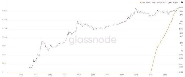 不過,盡管一些比特幣信仰者將這視為真正“hodlers”承諾的標志,但現實遠沒有那么浪漫。這些沒有動過的比特幣中有絕大多數很可能早已“死亡”。2019年1月3日,Glassnode的圖表開始顯示超過10年未移動的比特幣數量。這么做是因為當時距離比特幣網絡成立、中本聰開始挖早期的比特幣已經整整10年了。