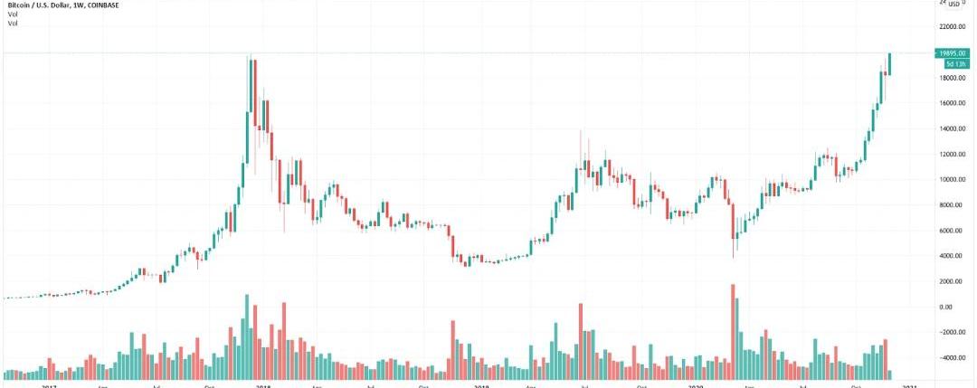 XRP/HKD-0.52%編者按:本文來自萌眼財經,Odaily星球日報經授權轉載。加密貨幣領域一直沉迷于2017年冬季的牛市,但隨著比特幣突破其歷史最高價19655美元,加密世界可能正在向未知領域進發。很多因素的結合為比特幣超越2017年高點創造了合適的環境。2020年春季期間,COVID-19導致市場崩潰,BTC瞬間跌至5000美元左右,然后強勁復蘇的前景推動了新的投資。而今年晚些時候,有消息稱PayPal將支持加密貨幣的買賣,以及美國總統大選帶來的不確定性,也進一步推動了比特幣的走勢。
