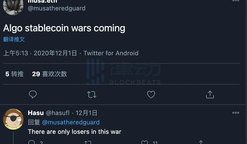 Deribit的Hasu在一個算法穩定幣即將大爆發的帖子下面評論道,這些算法穩定幣只會是這場「戰爭」的失敗者。