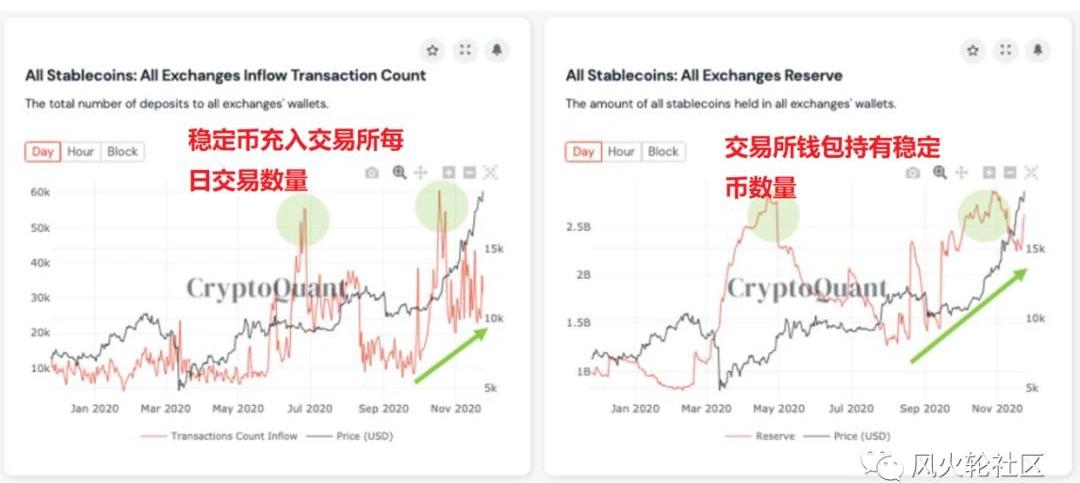 wbtc存進來4億美金,只借出去了500萬u的量,而像DAI/USDC這些基本上都是80%的供應量被借出的狀態,可想而知這些資金都在干嘛。另一個是11月份的數據,沖入交易所的穩定幣的量和頻率都在增長: